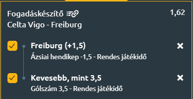 A Freiburg háromgólos előnyből érkezik, stabil védekezéssel és kontrollált tempóval játszik, így nagyon kicsi az esélye annak, hogy két góllal kikapjon. A Celta formán kívül van, az utóbbi négy meccsén tizenkét gólt kapott, és bár otthon próbál majd nyomást gyakorolni, a németek nem fognak feleslegesen kinyílni. Ez a visszafogott ritmus természetesen az alacsonyabb gólszám felé tolja a találkozót, így a 3,5 gól alatti határ is jól illeszkedik a várható forgatókönyvhöz. A két feltétel egymást erősíti, ezért a 1,62-es szorzó kifejezetten kedvező!