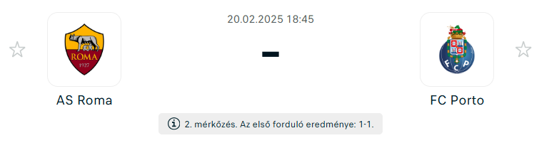 - A Roma jelenlegi formája, valamint hazai pályán mutatott stabilitása miatt esélyesebbnek tűnik. Ranieri csapata jól szervezett, és a nemzetközi rutinjuk is előnyt jelenthet egy hullámzó teljesítményt nyújtó Porto ellen. Hazai győzelem várható, olasz továbbjutással.