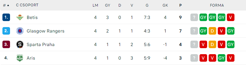 - A vendégek viszont eddig lenyűgöző teljesítményt nyújtottak az EL-ben. A tavalyi szezonban a La Ligában elért hatodik helyezés biztosította Manuel Pellegriniék számára az Európa Liga-részvételt, és jelenleg a legjobb helyzetben vannak a továbbjutás szempontjából, hiszen az első négy mérkőzésükből kilenc pontot szereztek. Az előző fordulóban az Aris ellen játszottak, és Pellegrini csapata meggyőző, 4-1-es győzelemmel - Borja Iglesias, Aitor Ruibal, Marc Roca és Abde Ezzalzouli góljaival - tovább szilárdította pozícióját a csoport élén. Ezzel az eredménnyel a Real Betis két ponttal megelőzte a Rangerst, de a harcnak még koránt sincs vége közöttük az első helyezésért. Az utolsó fordulóban egymással játszanak Sevillában majd! A Betisben rengeteg a sérült, Vieites; Ruibal, Pezzella, Riad, Miranda; Roca, Carvalho; Abde, Perez; Jose mind-mind maródiak, ami a legkomolyabb baj, az a kapusposzt, hiszen ott Claudio Bravo és Rui Silva is sérült, így még mindig Fran Vites lesz a helyettesük. Hector Bellerin, German Pezzella, Chadi Riad és Juan Miranda szilárd és erős védősort biztosít majd, Nabil Fekir visszatérhet a kezdőcsapatba az egyedüli csatár mögött afféle szabadon mozgó visszavont támadónak.
