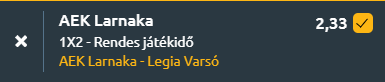 Egy Single Value Tipp következik, vagyis a sportfogadásban egy olyan értékelhető szorzó, amely single játékba küldés esetén is értéket hordoz magában! Az AEK Larnaca hazai pályán fogadja a Legia Varsót az Európa-liga harmadik selejtezőkörének első mérkőzésén. A ciprusi csapat otthon nagyon erős, ma is győzni készülnek!