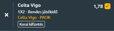 - Mire számíthatunk mindezek alapján? A Celta Vigo idén még nem nyert, erre most jó esélyük van. A görög ellenfelek elleni pozitív mérlegük és a Balaídos stadion közönsége további erőt adhat számukra. A PAOK ugyan stabil csapat, de jelenlegi formája gyenge, és a spanyol ellenfelekkel szembeni negatív múltja sem biztató. Mindezek alapján a papírforma a Celta sikerét valószínűsíti, amely egy szoros mérkőzésen, de megszerezheti első győzelmét az idényben.