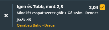 - Egy dolog biztos: nincs az az isten, hogy a Braga ne próbálja meg kicsikarni a továbbjutást. Hiába a Qarabag a bajnokcsapat Azerbajdzsánban (most is elsöprő fölénnyel vezetik a bajnokságot), azért tőlük kikapni, velük szemben kiesni égő és fájdalmas lenne a Bragának. Kétgólos a hátrány, nem lesz idő lacafacázni, az első perctől kezdve menni kell. Erős a gyanúm, hogy a Qarabag masszívan próbál majd védekezni, hogy féken tartsa a vendégeket, de azért tudják azt is, hogy a portugáloknak ki kell nyílni, akkor meg jöhetnek a kontrák. Az azeriek otthon kakasok, oké, az ottani bajnokság színvonala ne legyen mértékadó, de azért a hazai bajnokságban pályaválasztóként 3 gólt lőnek átlagban, erre azért figyeljünk. Na meg arra is, hogy a Braga meg idegenben csípős, ők a portugál bajnokságban is tudják a 2 feletti gólátlagot, vendégként. Abszolút benne van ebben a visszavágóban, hogy megint gólzápor lesz, 5-6 találat sem elképzelhetetlen, én legalább hárommal azért kalkulálok, gólváltással. Mindkét csapat szerez gólt és több, mint 2.5 gól a mérkőzésen: 2.04