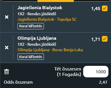 - Jagiellonia Bialystok – Bácska Topolya: A Jagiellonia Bialystok az első mérkőzésen dominált, rengeteg helyzetet alakított ki, egyértelmű fölényben volt. A lengyel csapat most is kiváló formában van, a bajnokságban holtversenyben az élen áll, és otthon különösen erős, hiszen 11 hazai meccse óta veretlen. Ezzel szemben a szerb Topolya gyenge formában érkezik a visszavágóra, hiszen négy meccse nem nyert, és az első mérkőzésen is alig tudott veszélyt jelenteni, amióta eladták Csirkovicsot a Ferencvárosnak a támadásaik kevésbé hatékonyak! Az utóbbi három Konferencia Liga-meccsükön kilenc gólt kaptak, és idegenben különösen sebezhetőek, hiszen nyolc európai vendégszereplésükből csak egyet nyertek meg. Mivel a Jagiellonia kétgólos előnyből várja a találkozót, nem kell kockáztatnia, míg a vendégeknek muszáj lesz támadniuk, ami még több lehetőséget adhat a lengyeleknek. A jelenlegi forma és a hazai pálya előnye miatt várhatóan a Jagiellonia újra nyerni fog, és magabiztosan jut tovább a legjobb 16 közé.