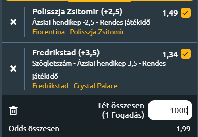 - Fredrikstad – Crystal Palace: Szintén a Konferencia Liga playoff, ahol a Palace hazai környezetben kissé tartalékon pörögve éppen csak 1-0-ra nyert a Fredrikstad ellen! Ez pedig nagyon soványka előny, a norvégok a csúcsra pörgetve, motiváltan és nagyon agresszívan fognak játszani, ha a Palace nem akar kiesni, akkor bizony most sokkal jobban oda kell tennie magát! A londoni alakulat a hétvégén a gyengén kedző Aston Villához utazik, ahol nagyon nehéz dolguk lesz majd. Egyik meccsen sem mehetnek biztosra, egyik meccsen sem tartalékolhatnak. Szoros mérkőzés várható, ahol esélyesebb a Crystal Palace, de ez a meccs sem lesz sima sokgólos vendéggyőzelem! Itt a Fredrikstad +3,5 gól hendikepet választottam!