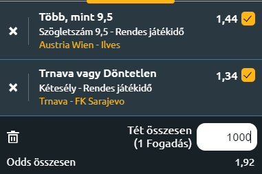 - Trnava – Sarajevo: Az első meccsen látható volt, hogy a szlovák csapat abszolút a biztosra ment. Teljesen visszaálltak, átadták a labdát a hazaiaknak, hogy szervezzenek, az adódó néhány kontrahelyzetből összesen 6 kapura lövést eresztettek meg, de veszélyes helyzet egy sem volt! A Sarajevo próbálkozott, de nem tudtak megfelelő minőséget rakni a játékukba. Mivel a szlovák csapat nem kockáztatott maradt a 0-0 és a döntetlen. Ma hazai pályán viszont támadni kell majd, ez pedig a vendégeknek is ad majd lehetőséget. A kis méretű minőségi különbség és a hazai pálya előnye miatt 1X a tippem. Nem kap ki a Trnava.