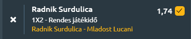 - A szerb élvonal mai játéknapján A Radnik Surdulica hazai körülmények között fogadja a Mladost Lucani gárdáját. A találkozó két középcsapatot hoz szembe, ahol a hazaiak esélyesebbnek számítanak, de a vendégek sem adják majd olcsón a bőrüket. A Radnik Surdulica jelenleg a 7. helyen áll a bajnokságban, hét győzelemmel, nyolc vereséggel és két döntetlennel. Átlagban 1,41 gólt szereznek és 1,35-öt kapnak mérkőzésenként. Az utóbbi öt találkozón három győzelmet, egy döntetlent és egy vereséget értek el, átlagban 1,4 gólt szerezve és mindössze 0,6-ot kapva, ami stabil védekezést mutat. Legutóbb november 30-án idegenben 2-0-ra győzték le a Bácska Topolya csapatát, így motiváltan várják a kezdő sípszót. A Mladost Lučani a tabella 9. helyén áll, hat győzelemmel, öt vereséggel és öt döntetlennel. Az utóbbi öt mérkőzésükön három győzelmet, egy döntetlent és egy vereséget jegyeztek, átlagban 1,4 gólt szerezve és 1,0-t kapva. Legutóbb december 3-án 2-0-ra kaptak ki a Radnički Kragujevac ellen, ami visszaesést jelentett számukra. A mérkőzés várhatóan szoros és kevés gólt hozó találkozó lesz, hiszen mindkét csapat mérkőzésein gyakran alacsony a góltermés. A Radnik Surdulica hazai pályán szerepel és jobb formában is van, így várhatóan egy szoros kevés gólt hozó meccsen nyernek a hazaiak.