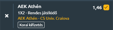 - A görög csapat legutóbbi mérkőzésén 5–0-ra nyert a Panaitolikos ellen, és kiváló formában van, hiszen az elmúlt öt meccsét kivétel nélkül megnyerte, meccsenként átlagosan három gólt szerezve. Az aktuális Konferencia Liga-idényben öt győzelem, egy vereség és öt döntetlen a mérlegük, 1,64 lőtt és 0,82 kapott gólos átlaggal. Az Universitatea Craiova a 23. pozícióból érkezik, legutóbb 2–0-ra győzte le a Hermannstadtot, az elmúlt öt találkozón két győzelem, két döntetlen és egy vereség a mérlege. A sorozatban hat győzelem, négy vereség és egy döntetlen mellett ugyanúgy 1,64 gólt szerez átlagban, de 1,18-at kap. A két csapat legutóbb 2019-ben találkozott, akkor 1–1-es döntetlen született, az elmúlt két egymás elleni meccsből egyet az AEK nyert, egy döntetlen lett, a gólátlag is a hazaiak felé billen. A pillanatnyi forma, a tabellán elfoglalt hely és a minimális minőségi különbség alapján az AEK Athén esélyesebb, és hazai pályán közelebb áll a győzelemhez az Universitatea Craiovával szemben.