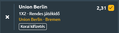- A középmezőnyben álló Union Berlin a kiesés elől menekülő Werder Brement fogadja a Bundesligában. A hazai gárda a szezon elején még a Stuttgart ellen 2–1-es győzelemmel rajtolt, de azóta elhalványult a lelkesedés, az utóbbi kilenc meccséből csak egyet nyert meg, négy vereség és négy döntetlen mellett. A Bayer Leverkusen elleni ritka, 1–0-s siker után rögtön újra kikapott, amikor a Borussia Mönchengladbach 1–0-ra felülmúlta. A fővárosi csapat 28 ponttal a 10. helyen áll, 15 pontra a hatodik helytől, miközben a kiesőzóna is csak hat pontra van. Hazai pályán valamivel stabilabb, az utóbbi öt meccséből csak egyet veszített el a Stadion An der Alten Förstereiben, bár a szezonban 12 otthoni bajnokiból csak négyet nyert meg. A Werder január végén menesztette Horst Steffent, majd Daniel Thioune érkezett a kispadra, aki három vereséggel kezdett, de február végén 2–0-ra legyőzte az utolsó helyen álló Heidenheimet. A brémaiak 22 ponttal a 16. helyen állnak, és csupán egy pontra vannak a St. Pauli és a Mainz 05 mögött. Idegenben viszont gyengék, az utóbbi hét vendégmeccsükből csak egyen maradtak veretlenek, ráadásul az utolsó öt túrából négyen gólt sem szereztek. A hazai pálya és a stabilabb védekezés dönthet és nyer az Union.