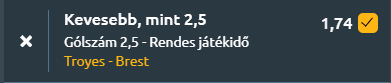 - A Troyes a kupában remek teljesítményt nyújt, míg a bajnokságban kiszámíthatatlan. Az eddigi négy kupamérkőzésükön csupán egy gólt kaptak, és ha ők szerzik az első találatot, rendszerint meg is nyerik a meccset. A Rennes ellen azt is bizonyították, hogy kevés labdabirtoklás mellett is hatékonyak lehetnek. A Brest viszont jó formában van a Ligue 1-ben, az utóbbi négy meccséből hármat megnyert! Ráadásul a gárda idegenben is megbízhatóan teljesít a kupában, különösen alacsonyabb osztályú ellenfelekkel szemben. Várhatóan Troyes defenzív felfogásban lép pályára, de Brest erősebb támadósora végül feltörheti a védelmüket, de nem lesz több gól, mint kettő!