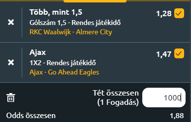 - Ajax - Go Ahead Eagles: Az Ajax nagyon gyenge szezont fut, mindössze csak az 5. helyen állnak, nyolcpontos lemaradással a 4. helyezett AZ Alkmaar mögött. Az utóbbi négy mérkőzésen veretlenek, és nyolc pontot szereztek ebben az időszakban, egyelőre csak az EKL-playoffban tudnak szerepelni, ha az EL-be akarnának indulni akkor be kell hozni a nyolcpontos hátrányt. Ehhez pedig minden egyes hátralévő meccsüket meg kell nyerni! A Go Ahead Eagles csapata az egyik legjobb szezont futja az utóbbi időben, bár az utóbbi öt mérkőzésükből háromat elvesztettek. René Hake csapata visszatért a győzelem útjára a hétvégén, 3-0-ra győztek az Excelsior ellen, megerősítve ezzel a hetedik helyüket. Ugyanakkor vendégként nagyon gyengék és az Ajax pedig alapvetően is sokkal komolyabb minőséget képvisel. Ez ma hazai győzelem lesz!
