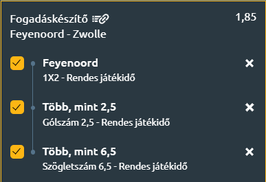 Tipp: Feyenoord nyer + több, mint 2,5 gól a meccsen + több, mint 6,5 szöglet a meccsen