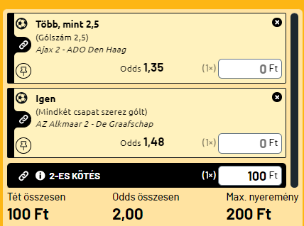 - Jong Ajax - Den Haag: A mai napon a holland kettőhöz fordultam, hogy egy olyan szelvényt válasszak, amelynek mindkét meccsén erősen esélyes a gólváltás. Mivel a holland foci alapvetően is a támadásra épül, már csak meg kellett nézni mely gárdáknál gyakori a gól. Két ilyen meccset már találtam. A Jong Ajax - Den Haag összecsapáson a hazaiak tele vannak tehetésggel! Náluk soha nem az számít, hogy az ifi megnyerje a bajnokságot, hanem az, hogy a focisták egyénileg fejlődjenek! Az Ajax tarcsi védelme nagyon gyenge, de a támadásban jók! Sok gólt lőnek, sokat kapnak! A Den Haag erősebb gárda, a harmadik helyen állnak. Ők is jól támadnak, van minőség a keretükben, fe a védelmük sokkal-sokkal jobb! Ezen a meccsen az over 2,5 az esélyes!