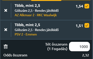 - Jong AZ - RKC Waalwijk: Szintén a holland második liga nyitófordulója, ahol a Hollandiában rendkívül erősnek számító AZ Akadémia csapata fogadja hazai körülmények között az RKC Waalwijk csapatát. A mérkőzés két, támadásban erős, de védekezésben sebezhető csapatot hoz szembe egymással, így minden adott egy nyílt, gólgazdag találkozóhoz. A statisztikák a hazaiak esélyeit valamivel magasabbra értékelik, de a vendégek legutóbbi mérkőzése és a korábbi egymás elleni eredmények is figyelmeztetnek arra, hogy bármi megtörténhet. A Jong AZ utóbbi öt meccsének gólátlaga 3,0, míg az RKC Waalwijké 5,0, ami extrém gólgazdag mutató. Az RKC hátul gyengélkedik, de elöl bármikor képes betalálni, míg a Jong AZ hazai pályán stabilan és eredményesen játszik. Ezek együtt azt vetítik előre, hogy a mérkőzésen minimum három gól születik, nagy eséllyel több is.