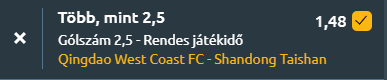 - A Qingdao West Coast és a Shandong Taishan összecsapása látványos, sokgólos mérkőzést ígér, hiszen mindkét csapat meccsei rendszeresen hoznak legalább három találatot, ez az utóbbi tíz meccsükből nyolc alkalommal is így történt. A statisztikák szerint 62% az esély arra, hogy mindkét csapat betalál, és ugyanennyi arra is, hogy a meccs eléri vagy meghaladja a 2.5 gólt. A tabellán előrébb álló Shandong Taishan tűnik esélyesebbnek, ráadásul az idény során eddig jobb formát mutattak, négy győzelem mellett csak egyszer kaptak ki, miközben meccsenként 2.33 gólt szereznek! A Qingdao ugyan veretlen idén, és az utóbbi öt meccséből kettőt megnyert, háromszor pedig döntetlent játszott, de védelme sebezhető, hiszen meccsenként átlagosan több mint két gólt is kap. Az előző egymás elleni találkozón meglepetésre a Qingdao idegenben győzte le a Shandongot, de az összesített mérleg inkább a Shandong felé billen. Összességében tehát egy nyílt, gólgazdag találkozóra számíthatunk, ahol bár a hazaiak veszélyesek lehetnek, a jobb formában lévő és támadásban hatékonyabb Shandong Taishan az esélyesebb, a meccsen pedig minimum három találat születik!