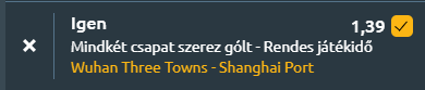 - Szintén a kínai Super League-ben, a 11. helyen álló Wuhan Three Towns hazai pályán fogadja a 4. helyen tanyázó Shanghai Port együttesét. A statisztikák alapján mindkét csapat jó eséllyel betalálhat, és egy nyílt, gólokban gazdag mérkőzésre van kilátás. A Wuhan Three Towns az idényben felemás teljesítményt nyújt, jelenleg csak a 11. helyen állnak a bajnokságban. Eddig három győzelmet arattak, négy vereséget szenvedtek el és kétszer végeztek döntetlenre. A támadósoruk egész jó formát mutat, meccsenként átlagosan 1.44 gólt szereznek, ám hátul gyengélkednek, ugyanis 2 gólt kapnak mérkőzésenként. A legutóbbi fordulóban idegenben győzték le a Henan Songshan Longmen együttesét 2–1-re, ami biztató jel lehet. Az utóbbi öt mérkőzésükön három győzelem, egy vereség és egy döntetlen a mérleg, közben 2.2 gólt lőttek és 1.8-at kaptak meccsenként, vagyis inkább a nyílt játék jellemzi őket. A statisztikák alapján a mérkőzéseiken gyakran esik sok gól, és a mindkét csapat szerez gólt opció is gyakori náluk (az utóbbi tíz meccsből hétszer). A Shanghai Port stabilabb szezont produkál eddig, ötször nyertek, kétszer kaptak ki, kétszer döntetlent játszottak, és ezzel a 4. helyet foglalják el a bajnokságban. A támadószekciójuk különösen erős, 2.22 gólt szereznek átlagosan meccsenként, míg 1.56-ot kapnak. Legutóbbi meccsükön ugyan vereséget szenvedtek (1–2 a Beijing Guoan ellen), de az elmúlt öt mérkőzésen így is kétszer nyertek, kétszer kikaptak és egyszer döntetlent játszottak, 2 gól lőtt és 1.8 kapott gól/meccs átlaggal. A legutóbbi öt egymás elleni találkozóból négyet ők nyertek, köztük a legutóbbi idegenbeli meccset 2–0-ra. Mindkét csapat előszeretettel játszik nyílt, támadó szellemű futballt, így sok gólt, gyors tempót és eseménydús találkozót hozhat ez a meccs. A vendégek jobb formája és pozitív egymás elleni mérlege miatt a Shanghai Port győzelme a legvalószínűbb, de a Wuhan hazai pályán veszélyes lehet. Összességében gólgazdag mérkőzésre van kilátás, mindkét oldalon góllal!
