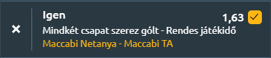 - A Ligat ha’Al felsőházi rájátszásában komoly erőfelmérés vár Maccabi Netanyára, amely hazai pályán fogadja a bajnoki címért harcoló Maccabi Tel Aviv együttesét. A vendégek esélyesebbek, de a hazaiak legutóbbi magabiztos győzelme miatt meglepetésre is van némi sansz! A Maccabi Tel Aviv nemcsak a tabella második helyét foglalja el, hanem az egymás elleni mérlegük is imponáló, hiszen az utóbbi öt összecsapást mind megnyerték Netanya ellen, átlagosan 3,4 gólt szerezve meccsenként. Ezzel szemben a hazaiak mindössze 1 gólos átlagot tudtak produkálni ellenük. A szezon során is komoly különbség mutatkozik, míg Tel Aviv 20 győzelmet aratott és több mint két gólt szerez meccsenként, addig Netanya 13 sikert könyvelhetett el, kiegyensúlyozott gólkülönbséggel (1,42 szerzett, 1,45 kapott gól). A legutóbbi fordulóban ugyan Netanya meggyőző, 3–0-s idegenbeli sikert aratott, de ez csak halvány reménysugár lehet a Tel Avivval szemben, akik ugyan döntetlent játszottak legutóbb a Hapoel Be'er Sheva ellen, de még mindig komoly játékerőt képviselnek. Mindenképpen egy nyílt, gólokban gazdag mérkőzés várható, ahol Tel Aviv dominanciája valószínűleg érvényesül majd, viszont a hazai pályán harcosan játszó Netanya is jó lesz egy gólra! Mindkét csapat betalálhat!