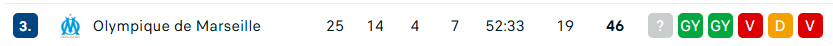 - A Marseille 25 mérkőzés után hatodszor szerepel az első három között az elmúlt tíz bajnoki évad tekintetében, ennél magasabb számmal csak a Paris Saint-Germain (10) büszkélkedhet. A kikötővárosiak csak egyszer csúsztak ki a Top 3-ból a szezon végén: 2017/18-ban a Lyon vágott eléjük.