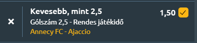 Ezek az ötletek kiválóan alkalmasak arra, hogy egy kétmeccses duplázóban az egyik tagot adják. Az odds alacsonyabb, viszont ezzel párhuzamosan a kockázat mértéke is csökken. A francia másodosztály 33. fordulójában az Annecy hazai pályán, a Parc des Sports stadionban látja vendégül az Ajacciót. Két középcsapat összecsapása ez, akik ugyan eltérő formát mutatnak, de közel azonos eséllyel indulnak.