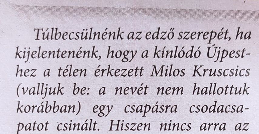 Milos Kruscsics ismertségével kapcsolatban pedig nem csak én nem hallottam a nevét, hanem egy csomó ismerős barátom sem, még Újpest-szurkolók sem. A mellékelt képen pedig az eheti Sport Plusz Fociból egy részlet Lakat T. Károly írásából. Ha valaki, akkor ő mérvadón nekem mindenképp! És az, hogy itt pár olvasó belémköt, hogy tudatlan vagyok, pont nem érdekel. Milos Kruscsics itthon ismeretlen szakembet volt. Csak a legfanatikusabb sportszakírók tudták ki ő és honnan jött. Persze mielőtt utánanéztek volna. Ez az igazság és az, hogy itt egyesek kötekednek velem, pont nem változtat semmit rajta!