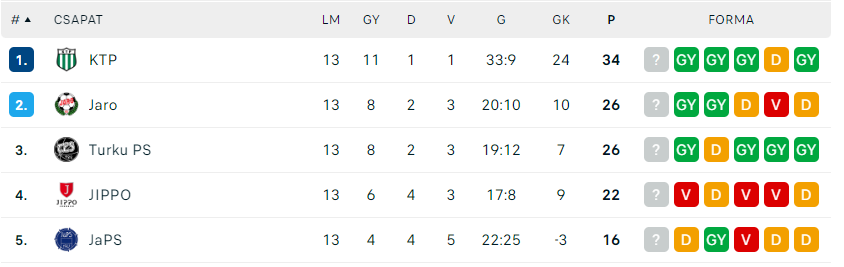 - Továbbá a Kotkai eggyüttes 13 meccsen 1 döntetlen és 1 vereség mellett 11 győzelem a mérlegük, amely igencsak bizadalomra ad okot a vendég győzelmet illetően.