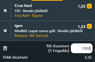 - Cruz Azul - Club Tijuana: Cruz Azul és Club Tijuana szerdán találkoznak, mindkét csapat három egymást követő győzelmet szeretne elérni. Mindkét csapat 100%-os mérleggel kezdte a Liga MX szezont, de ez most meg fog szakadni. A Cruz Azul vasárnap 4-0-ra győzött a Monterrey ellen, ezzel az első helyre került a tabellán. A hazai pályán jó formában lévő csapat magabiztosan várja a mérkőzést. A Club Tijuana szintén nyert szombaton 4-2-re a Guadalajara Chivas ellen, és jelenleg holtversenyben az első helyen áll a Cruz Azullal. Idegenben is javuló formát mutatnak. Szoros mérkőzés várható, ahol a hazai csapat várhatóan kis különbséggel nyer.