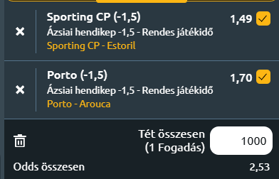 - Mindkét csapatból hiányoznak kulcsjátékosok, de ezt a minden szempontból középszerű Arouca jobban megérezheti, mint a mélyebb és minőségibb keretből gazdálkodó Porto. A vendégek a múlt hétvégi, Nacional elleni győztes meccsen pályára küldött kezdőből három játékost nem nevezhetnek a listavezető elleni találkozóra. A Sárkányok támadó hatékonysága az utóbbi időben kissé visszaesett ugyan, de védekezésben továbbra is a liga etalonjának számítanak: átlagosan 1,91 gólt szereznek és mindössze 0,30-at kapnak meccsenként. Pénteki ellenfelük 1,35 szerzett találatot átlagol, de közel kétszer annyit – 2,13-at – nyel be. Topcsapatok otthonában a mostani szezonban rendre „földbe állt” az Arouca – Sporting 6-0, Benfica 5-0 –, és úgy véljük, hogy a Porto dolgát sem tudja majd megnehezíteni a foghíjas vendégcsapat. Legalább kétgólos hazai győzelemre számítunk.