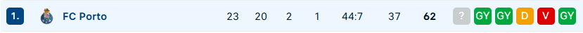 - Az FC Porto ebben a szezonban félelmetes a portugál ligában, 62 ponttal vezeti a bajnokságot, 20 győzelemmel, 2 döntetlennel és csak 1 vereséggel. A csapat lenyűgöző gólkülönbséggel büszkélkedhet, 44-szer talált be és csak 7-szer kapitulált.