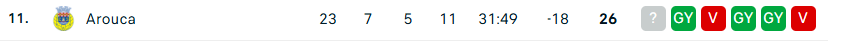 - Az FC Arouca a bajnokság 11. helyén áll 26 ponttal. Eddigi szezonjukat összességében a kiegyensúlyozatlan teljesítmény jellemezte: 7 győzelem, 5 döntetlen és 11 vereség, 31 kapott és 49 szerzett góllal.