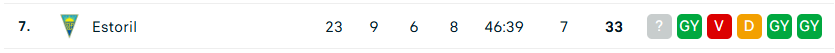 - Az Estoril a 7. helyen áll 23 mérkőzésen szerzett 33 ponttal. A Kanárik mérlege 9 győzelem, 6 döntetlen és 8 vereség, 46 lőtt és 39 kapott góllal. A támadási eredményességük a negyedik legjobb a ligában – még a listavezető Portót is felülmúlják e téren! –, védekezésben viszont csak öt csapat gyengébb náluk.