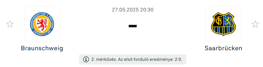 - Az Eintracht Braunschweig jó formában van, az első mérkőzésen idegenben szerzett 2:0-s győzelmük jelentős előnyt biztosít számukra. A gólokat Lino Tempelmann és Marvin Rittmüller szerezte, és várhatóan Marc Pfitzner vezetőedző nem változtat a győztes kezdőcsapatán. Bár Niklas Tauer hosszú távú sérülés miatt továbbra sem bevethető, a csapat formája bíztató. Az utóbbi öt hazai mérkőzésükből négy végződött legalább három góllal, köztük egy 1:4-es vereség a Nürnberg ellen, ami jól mutatja, hogy Braunschweig mérkőzései kifejezetten gólgazdagok, átlagosan több mint négy találat született ezeken a meccseken.