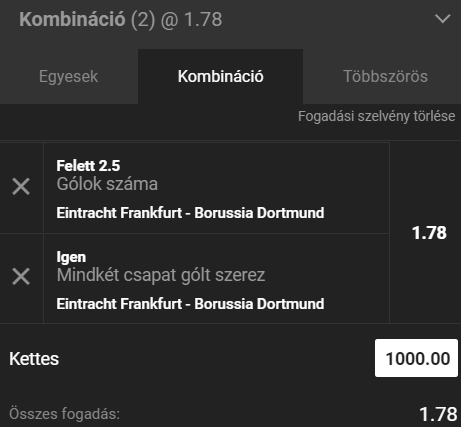 - Mostantól olyan meccseket keresek, ahol a mindkét csapat szerez gólt és az over 2,5 gól egyszerre teljesül. Ezekre a fogadásépítővel már kifejezetten jó szorzókat lehet kapni. Mára a Bundelsigából választottam egy meccset. A Dortmund évek óta az egyik leggólerősebb csapat a Bundesligában. Most is az eltelt 11 meccsen már 32 a gólok száma, azaz meccsenként majdnem megvan a 3 gól! Kiváló csatárok, támadó stílus és minden évben a BL, esetleg az EL csoportkör a cél, de elsősorban a BL. Az elmúlt 5 meccsen háromban jött az over.