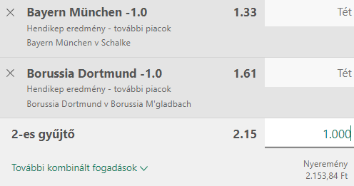- Bayern München – Schalke: Ha párosítjuk a Dortmund erős hazai formáját a Gladbach siralmas idegenbeli mérlegével, minden jel arra mutat, hogy a BVB ismét meggyőző győzelmet arat a Signal Iduna Parkban. Tekintettel arra, hogy Terzic emberei hazai pályán ftószalagon lövik a gólokat, simán elképzelhető, hogy a Dortmund egy gólgazdag győzelmet arat. (0-1 hendikep hazai).