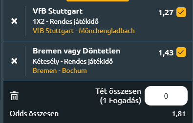 - Werder Bremen - VfL Bochum (11. - 14.): A 2023-24-es Bundesliga-idény utolsó játéknapján két olyan csapat feszül egymásnak a Weserstadionban, amelynek van miért küzdenie: a Werder Bremen a VfL Bochumot fogadja. A Bremen még a nyolcadik helyen végezhet a tabellán, ami akár európai labdarúgást hozhat a következő szezonra, míg a Bochum nincs teljesen biztonságban, ha minden balul üt ki, még ki is eshetnek. A Bochum az idei szezonban 16 idegenbeli bajnoki mérkőzéséből mindössze 10 pontot gyűjtött, miért pont ma változna ez meg, ráadásul egy olyan Werder ellen, amely még érdekelt a jó teljesítményben! Döntetlennél rosszabb eredményt nem várok hazai szempontból. 1X