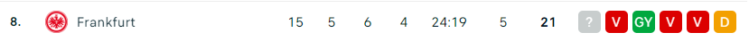 - A forduló előtt az Eintracht 21 ponttal a nyolcadik helyen állt a tabellán, három ponttal lemaradva a következő szezonban Európába vezető pozíciókban szereplő csapatoktól. Tekintettel arra, hogy a Top 4 csapathoz képest már tíz pont a különbség, kicsi az esély arra, hogy a frankfurtiak bekapcsolódjanak a Bajnokok Ligája küzdelmeibe, ehelyett be kell érniük az Európa Ligával vagy a Konferencia Ligával. Ha nem zuhannak össze tavasszal! Az elmúlt öt mérkőzésen az Eintracht három vereséget szenvedett (Stuttgart 1:2, Augsburg 2:1, Leverkusen 3:0), döntetlent játszott a Werder Bremen ellen, és hihetetlen, 5:1-es győzelmet aratott a Bayern München ellen! A házigazda ráadásul a második helyen zárta a Konferencia Liga csoportkörét, ezzel biztosította helyét a tavaszi kieséses szakaszban!