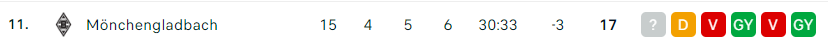 - A Borussia Mönchengladbach a szezon kezdete rendkívül hullámzó teljesítményt nyújtott, ennek megfelelően stabil középcsapatot alkotnak. Tizenöt mérkőzés után jelenleg a tizenegyedik helyen állnak 17 ponttal. Ugyanilyen messze vannak a kiesőzónától és az UEFA Konferencia Ligába vezető pozíciótól. Annak ellenére, hogy 30 gólt lőttek, amivel a Borussia a Bundesliga egyik leghatékonyabb csapata, a fő problémájuk a védekezésben van. A csapat eddig 33 gólt kapott a bajnokságban, amivel a második leggyengébb védekezés a ligában. Ezen mindenképpen javítani kell ahhoz, hogy elérjék az európai selejtezős helyek valamelyikét. A Mönchengladbach jobb formában van, mint mai ellenfelük, és nem kétséges, hogy ezt igyekeznek majd kihasználni, és veretlenül térni haza Frankfurtból. Nem lesz könnyű.