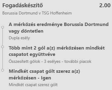 Ez a rovatom a Fogadáskészítő segítségével készült el. Az adott mérkőzést kielemezve 2-3 szempontból összeállított tippet küldök játékba, amelynek szorzója minden esetben a duplázó körüli értéket közelíti, de mégis jó esélyekkel indul! Az indoklást rendhagyó módon távirati jelleggel csinálom. Nincs fölösleges sallang, csak a sziklaszilárd tények. Ma a német Bundesligából választottam a Dortmund – Hoffenheim találkozót.