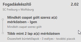 - A Wolfsburg mentálisan biztosan jobb formában van. Lendületben vannak, előre mentek a bajnoki tabellán, sorozatos jó teljesítményeket mutattak be. A Freiburg hiába van előrébb, a kudarcok miatt fejben nem lesznek annyira jók, a negatív hatások még uralkodnak majd. A mentális rész nagyon fontos, így ez a meccs egészen kiegyenlített lehet. Mivel pontokat csak győzelemmel lehet elérni, amihez meg gólok kellenek, mindkét csapattól várható a találat. De hogy nyerni fog-e valamelyik, az kérdés. Emellett a fokozott tét és győzelmi kényszer miatt várhatóak büntetőlapok is, legalább három várható és ez nem sok. Mindez együtt dupláz, ami egy olyan tipp, amelynek a kockázata is alacsony.