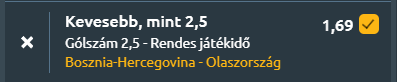 - Összegezve tehát: A bosnyák–olasz találkozó minden jel szerint a taktika és a fegyelem csatája lesz. Bosznia az utóbbi hónapokban sokat szenvedett hátul, a kapottgól‑mutatója rendszeresen 1,5 fölé kúszik, és a meccsek végén rendre szétesik a védelem. Olaszország ezzel szemben a megszokott, kimért, kontrollált futballját hozza, kevés helyzetet enged, és ritkán vállal fölösleges kockázatot. A két csapat statisztikai profilja szinte tökéletesen tükrözi egymást, az egyik sokat kap, a másik keveset enged, így a játék képe előre borítékolható. A FootyStats adatai szerint az olaszok gólváltás‑aránya alacsony, kevés gólt szednek be, gyakori a kapott gól nélküli találkozójuk. A felek korábbi meccsei is inkább a kevés gólos, feszes találkozók közé tartoztak. Bosznia számára most is inkább a túlélés lesz a cél, mint a nyílt támadófutball. A mérkőzés legvalószínűbb forgatókönyve az olasz dominancia, kevés góllal. A statisztikák alapján az Under 2,5 nemcsak a jó kimenetel, hanem a legjobb értéket is kínálja a piacon.