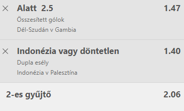 - Indonézia – Palesztina: Indonézia szerdán Palesztina ellen lép pályára egy felkészülési mérkőzésen, mielőtt a világbajnok Argentínával találkozik. Minden bizonnyal már ez az összecsapás jár a fejekben, ezért ma nem a legmotiváltabb Indonézia várható. Ennek ellenére olyan különbség van a csapatok között, hogy nem kap ki Indonézia. 1X a tipp.