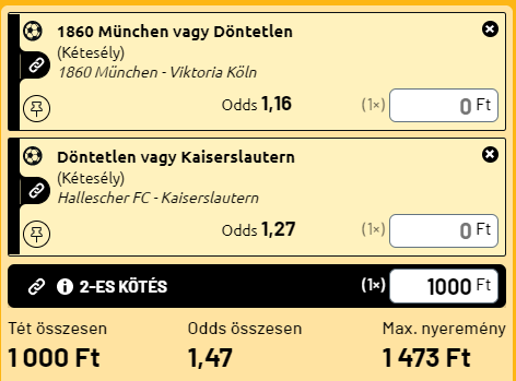 - Két olyan csapat játszik ma bajnoki meccset a német 3. ligában, amelyek egykor a Bundesligában küzdöttek, sőt egyikük, a Kaiserslautern még bajnok is volt! Mára gazdasági problémák hatására, az évek során a Bundesliga 3-ig süllyedtek vissza, de ott abban a ligában az erősebb csapatok közé tartoznak. A biztonság miatt pedig nem sima győzelmekre fogadtam ma, hanem kétesélyekben gondolkodtam. X vagy Kaiserlsautern és X vagy 1860 München a magabiztosság jegyében!