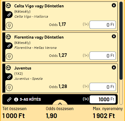 - Mára két mérkőzés a Serie A-ból és egy a La Ligából egy szelvényre. A Juventus idén nem lesz bajnok, de a BL-t érő 4. hely reális. Mondjuk azért a Speziát illene simán megverni akkor is, ha egyelőre az Atalanta és a Roma némiképp gyengébbnek néz ki, mint az Öreg Hölgy. Ez sima győzelem. A Fiorentina számára ma egy kiváló lehetőség adódik, hogy hazai pályán elért győzelmével leszakítsa magáról a Veronát, ezzel is megtartva az esélyt még a 6. helyre. A spanyoloktól egy olyan meccset vettem kétesélyre, amely a forma és a keretek közti különbség miatt is sima hazainak tűnik, de a biztonság kedvéért maradok az 1X-nél.