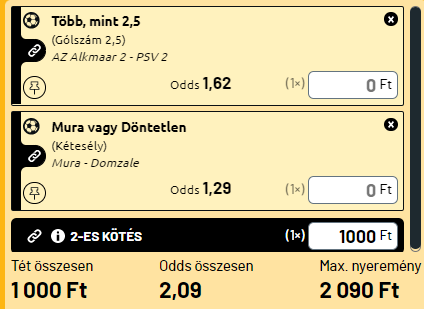 - A második meccs a holland 2. liga, amelyet egyrészt a holland támadófutball jellemzi, másrészt a PSV és a az AZ az élvonal egy-egy jó csapata, a második gárda is jó képességű fiatal játékosokból áll. Nagyon gyakori az over, ma is esélyes kettejük között.