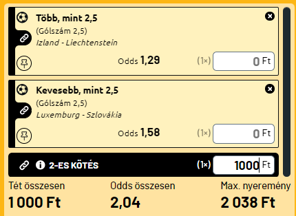 - Izland – Lichtenstein: A szelvény másik meccse szintén ebből a csoportból érkezik. Izlandnak muszáj győznie, ahhoz, hogy versenyben maradjon a második helyért. Két győzelem, négy vereség és egy döntetlen elég hét pontra, ami hat ponttal kevesebb, mint a második helyen álló Szlovákiáé. A legutóbbi mérkőzésen döntetlent értek el Luxemburg ellen, pedig végig domináltak a mérkőzésen. Ezt a dominanciát nem sikerült több potenciális lehetőséggé alakítaniuk, így végül 1:1-re végződött a mérkőzés. Ezt megelőzően a bosznia-hercegovinai válogatottat 1:0-ra legyőzték Luxemburgtól idegenben 3:1-re, Portugáliától pedig otthon 1:0-ra kaptak ki. Szlovákiával szemben nem volt szerencséjük, akik 2:1-re verték őket. A mai ellenfelet már 7-0-ra legyőzték egyszer. Ma is meg fogják szórni őket, legalább három gólt várhatunk.