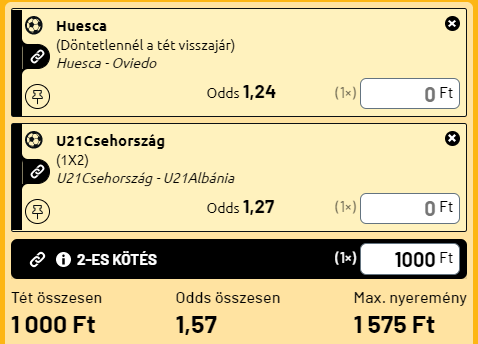 - A másik találkozón már nem sima hazai a tipp, pedig a tabella alapján lehetne. A Huesca három meccs után 6. úgy, hogy egy meccsel kevesebbet játszott. Két győzelem után kikaptak az egyik erős rivális, a Las Palmas otthonában. Egy remek erős védelem dolgozik hátul, a két szélen Buffarini és Mateu a védekezés mellett a támadásokat is segíti felfutásokkal és jó beadásokkal. Középen pedig Pulido és Salvador a két bekk. A támadósornak még fejlődnie kell, de alapvetően a csapat jó és a céljukat, a rájátszás lehetőségét el fogják érni. Az ellenfél a Real Oviedo sosem látott mélységekbe süllyedt. Jelenleg 19. helyen áll a másodosztályban és össze kell kapniuk magukat. Három meccset játszottak ők is, de még nem tudtak nyerni, két döntetlen és egy vereség a mérleg. Minden jel arra mutat, hogy a kiváló formában lévő Huesca otthon tartja a három pontot, de a Real Oviedo múltja és a La Liga 2 kiegyensúlyozottsága miatt a döntetlent kizárom.