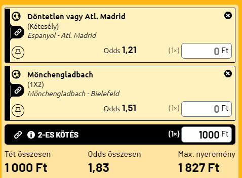 - A szelvény másik az Atletico Madrid barcelonai csatája. Az ellenfél pedig nem Messi excsapata, hanem az újonc Espanyol lesz, akik ellen a tavalyi bajnok minimum egy döntetlennel kalkulálhat. Két jó meccs, remek eredő ismét! Használjuk ki.