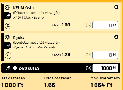 - Norvég másodosztály. A KFUM Oslo elég jó csapat ahhoz, hogy bejusson a rájtászásba, de sem a Jerv, sem a Fredrisktadtnál nem jobbak. Ma viszont a 12. helyezett Byrne ellen játszanak, masszív hazai eséllyel, különösen azért, mert legutóbb kikaptak a listavezető Ham Kamtól. Ma javítani fognak. A szelvény biztonsága miatt a döntetlen tét visszajár-opciót is figyelembe veszem.