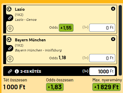 - Ma két olyan meccset hoztam egy biztonsági szorzóért, ahol egy nagyon erős-, európai kupaporondra is esélyes csapat, európa-klasszisokkal a soraiban fogad egy alacsonyabb szinten lévő csapatot az adott bajnokságból. Az egyik mérkőzés a Bayern – Wolfsburg. Itt a zöldek nincsenek is olyan jó formában, mint tavaly, a bajorok pedig évtized óta kiemelkednek a német viszonyokból. Sima hazai siker várható. A másik mérkőzésen a Milinkovic-Saviccsal, Luvas Leivával és Felipe Andersonnal felálló Lazio a Genoát fogadja. Igaz, Immobile és Pedro is sérült, de ennek ellenére hazai győzelemre lehet számítani.
