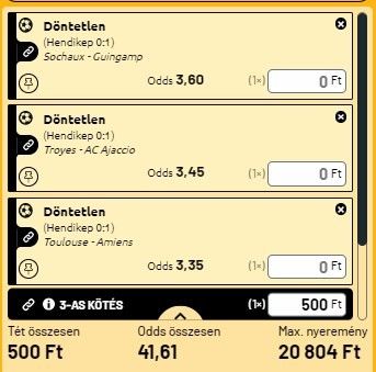 Tegnap sajnos egy sem jött, de ma francia 2-vel próbálkozom csak. A hazai pályán szereplő csapatok esélyesebbek a győzelemre, mindhárom esetben 0-1-es hendikepről döntetlent kell játszani.