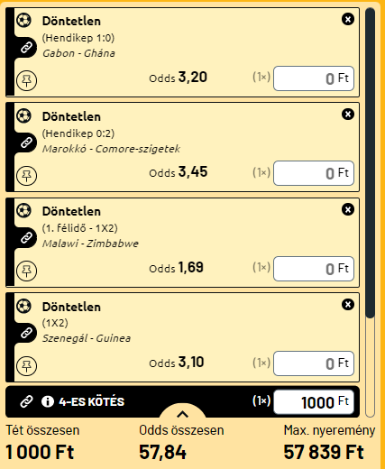 - A B csoport másik két „lúzer” csapata Malawi és Zimbabwe. Itt azért kicsit odarakják majd magukat, ahogy annak idején mondta Vitár Róbert (asszem) egy ANK-közvetítés kapcsán, hogy kemény a fiú, mint a dorogi brikett! :D Azóta is felröhögök, ha ez eszembe jut. Szóval itt a félidő döntetlent választom, de ahogy mondani szokták: Afrika Kupán az under 2,5-et szinte mindenre rá lehet húzni. Ennek megfelelően kicsi is a szorzó mindig.