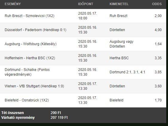 A mai szelvényem az újrainduló Bundesliga egyes meccseiből és egy fehérorosz bajnokiból áll össze. Nektek mi lenne az ezredesetek a hétvégére? Ha becsatoljátok a szelvényt a kommentmezőbe, akkor tudunk rajta vitatkozni egyet! :D